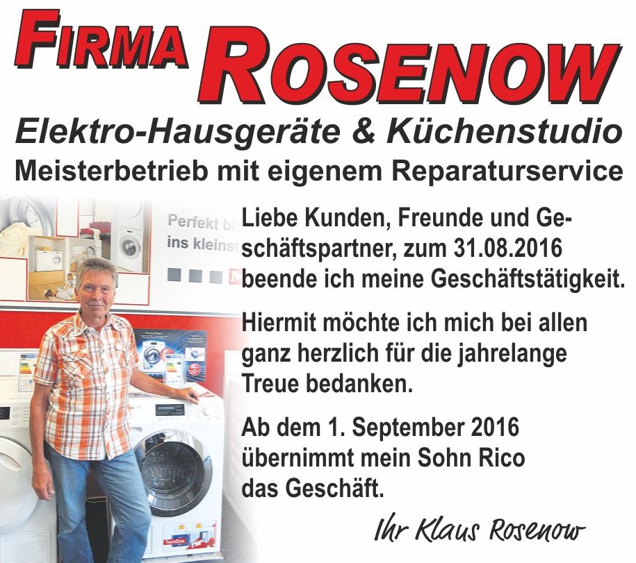 Die Handwerkskammer des Landes hatte 2016 geprüft und befürwortet, das Klaus Rosenow, der selbst 1980 in das Geschäft seines Vaters eingestiegen ist, zum 01.09.2016 die Geschäfte an seinen Sohn Rico Rosenow übergeben konnte. Er ist gelernter Elektroinstallateur und arbeitet seit Februar 1995 in der väterlichen Firma. Erwin Rosenow gründete 1961 den Familienbetrieb. Zunächst als Schlosserei geführt, wandelte sich das Unternehmen in der ehemaligen DDR Stück für Stück zum Dienstleister, der Reparaturarbeiten an Haushaltsgeräten ausführte - in erster Linie für Waschmaschinen.